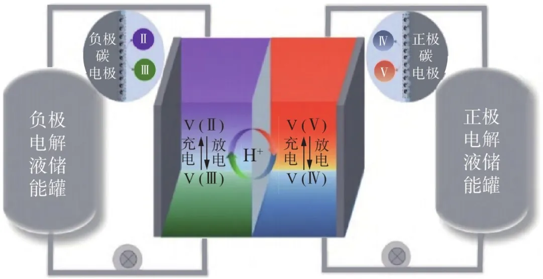 全釩氧化還原液流電池,簡稱釩電池(Vanadium redox battery, VRB)由澳大利亞Skyllas-Kazacos在1985年首次提出,國內(nèi)中科院大連化學物理研究所從2005年開始VRB的研究。釩電池儲能系統(tǒng)由正、負極碳電極,正、負極電解液儲能罐,離子交換膜組件等構成,其示意圖如圖5所示。釩電池具有可瞬間充電、大功率、大容量、安全性高等優(yōu)點,能解決大規(guī)模新能源發(fā)電并網(wǎng)需要、合理配置儲能系統(tǒng),滿足大容量電能的存儲和轉換對儲能電池的特殊需求。因而釩電池“當仁不讓”地成為新能源儲能、電網(wǎng)調(diào)峰、備用電源等領域的首選,被形象的稱為儲能“銀行”。據(jù)《中國釩電池行業(yè)發(fā)展白皮書(2022年)》預計,2025年釩電池新增規(guī)模將達到2.3 GW,2030年將達到4.5 GW,當年新增市場規(guī)模約405億元。